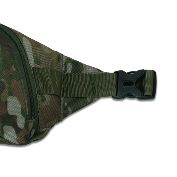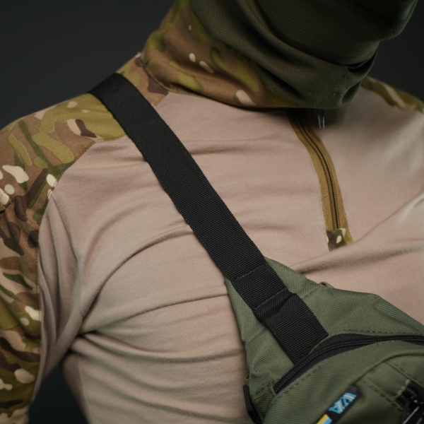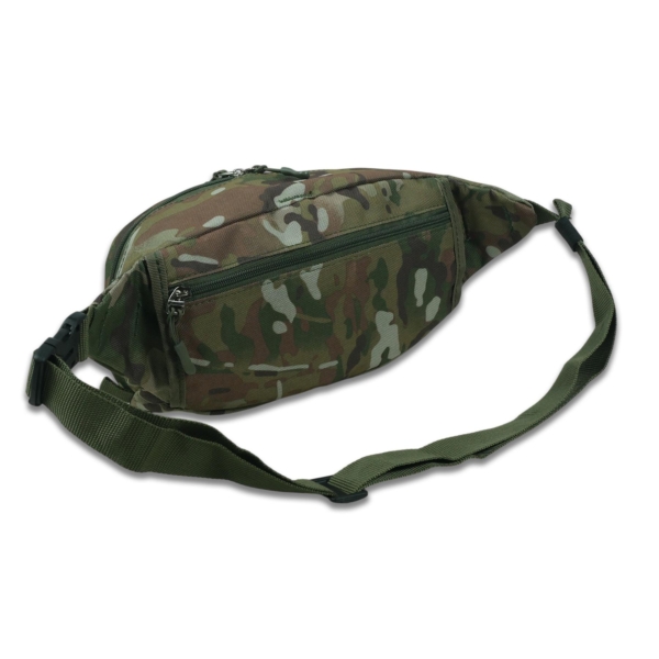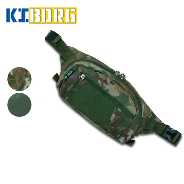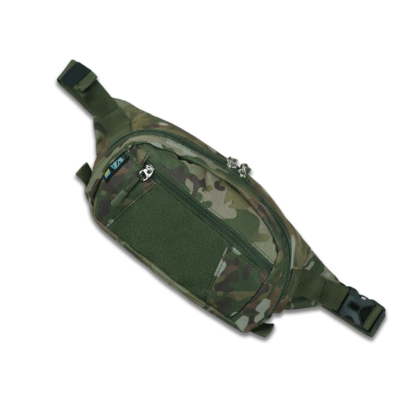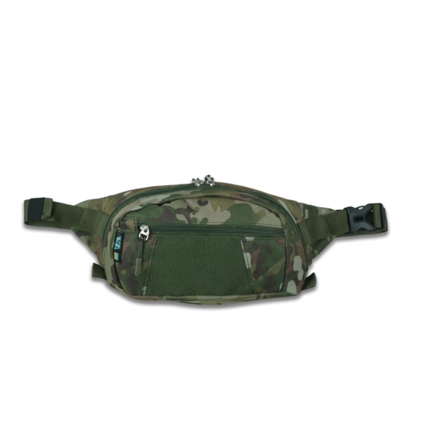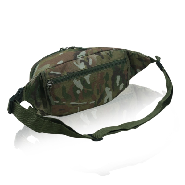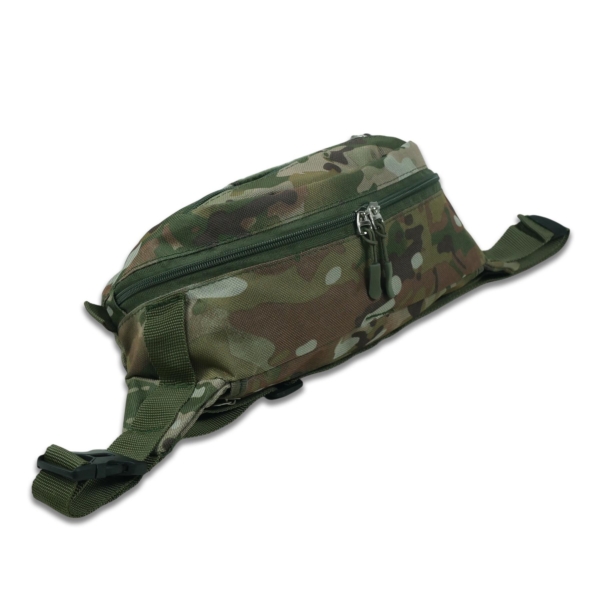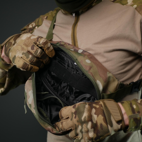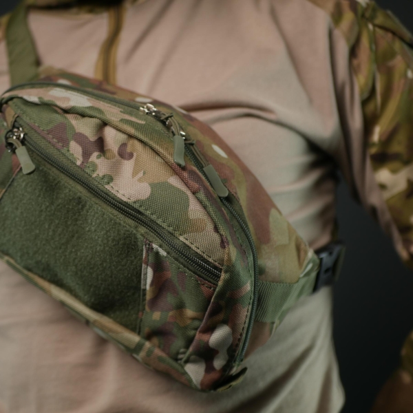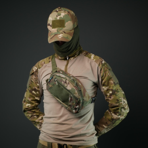 Універсальна тактична бананка середнього розміру в популярному камуфляжному кольорі мультикам. Виготовлена з міцного нейлону, стійкого до зносу та вологи. Завдяки продуманій конструкції і компактності, ця сумка стане зручним рішенням для щоденного використання, активного відпочинку, тренувань або тактичних завдань.