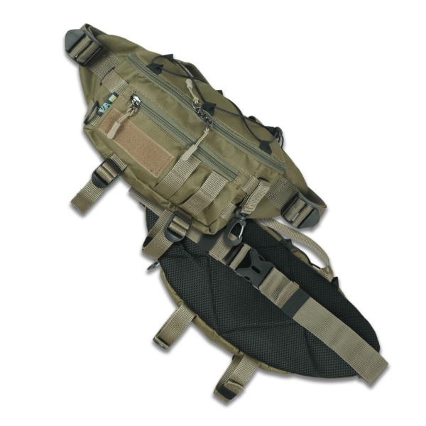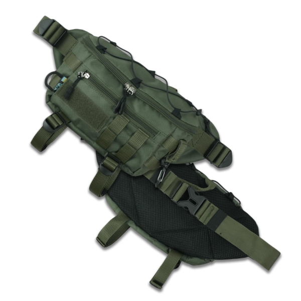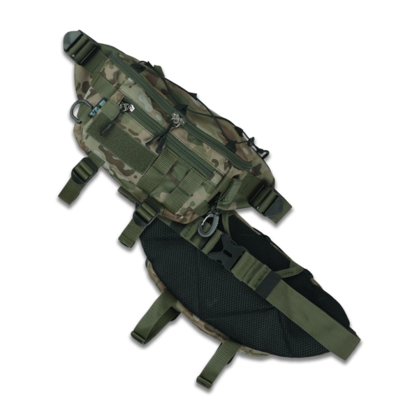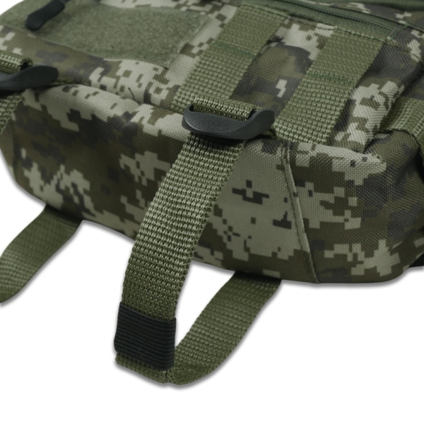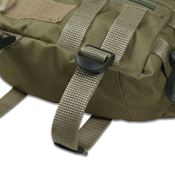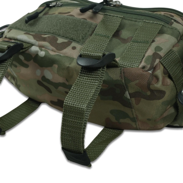 Має одне основне відділення з внутрішніми кишенями та передню кишеню для дрібниць. Оснащена системою MOLLE, липучкою для патчів чи шевронів, карабіном та регульованим поясом. Нижнє кріплення дозволяє фіксувати додаткове спорядження, а верхня еластична резинка зменшує об’єм і може використовуватися для закріплення речей зовні.