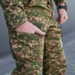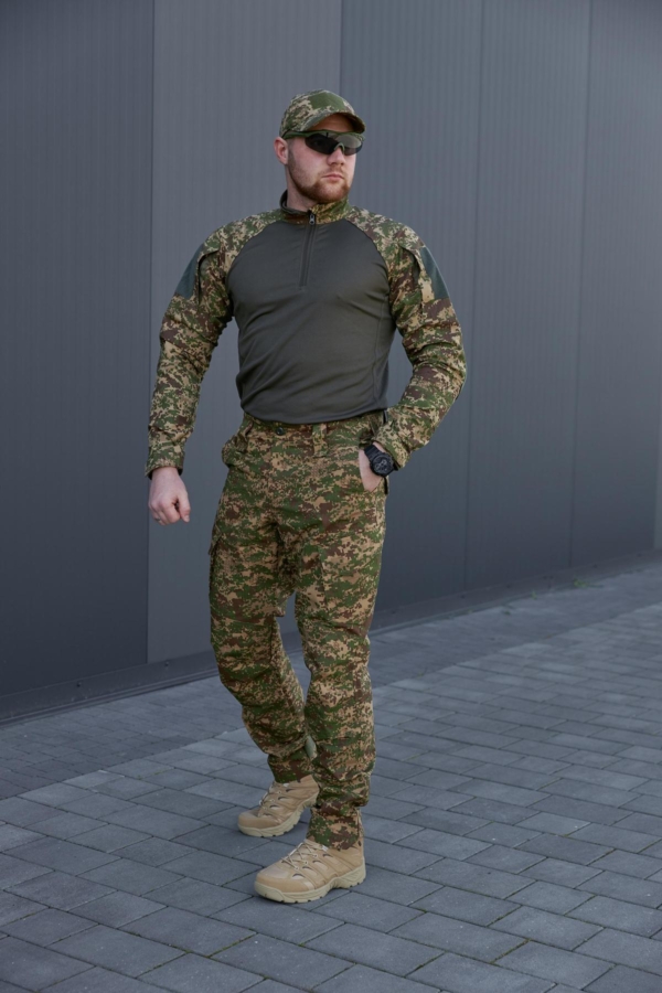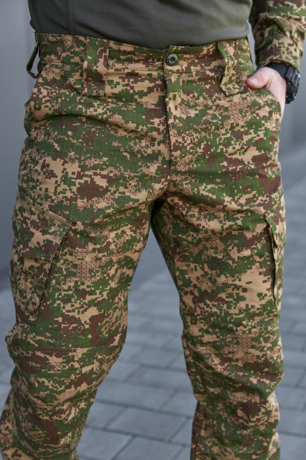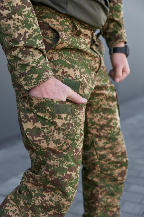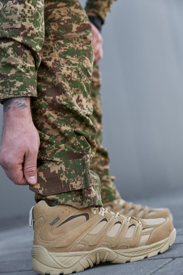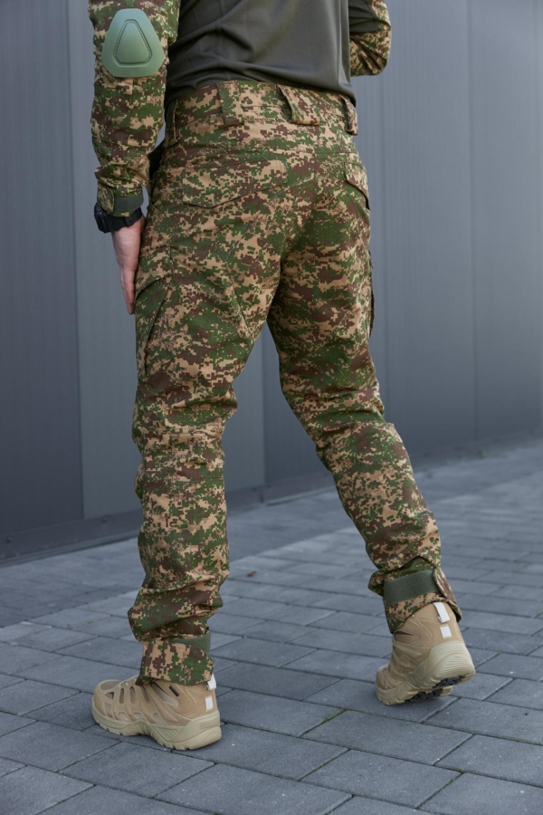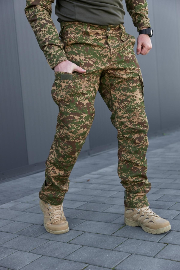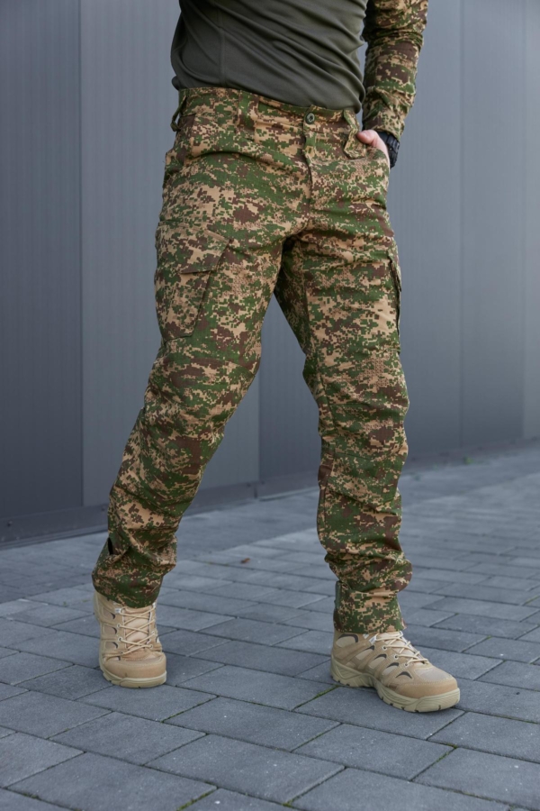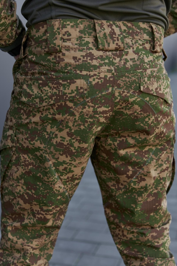 Виготовлені в Україні з тканини ріп-стоп, що складається з 65% бавовни та 35% поліестеру. Виріб відзначається високою якістю пошиву — зони підвищеного навантаження посилені та додатково прошиті для забезпечення довговічності. Штани підійдуть для активного використання в різних умовах, забезпечуючи комфорт і витривалість.