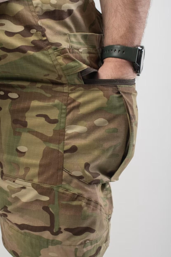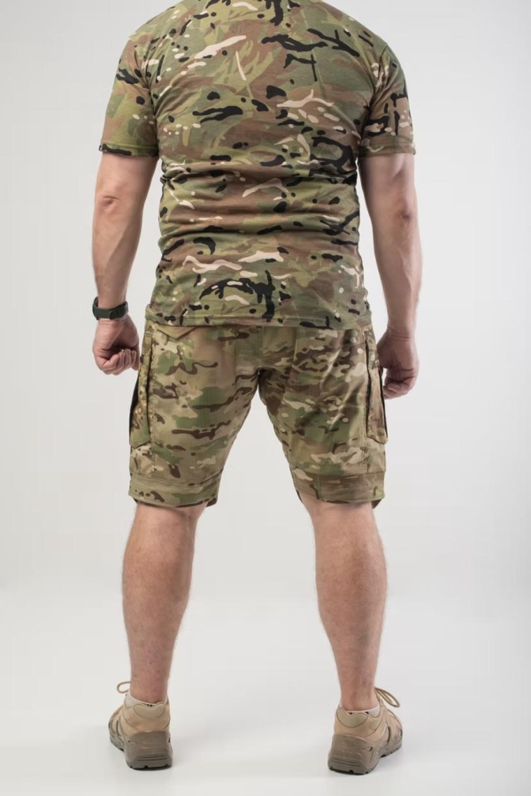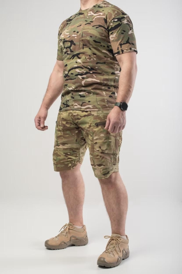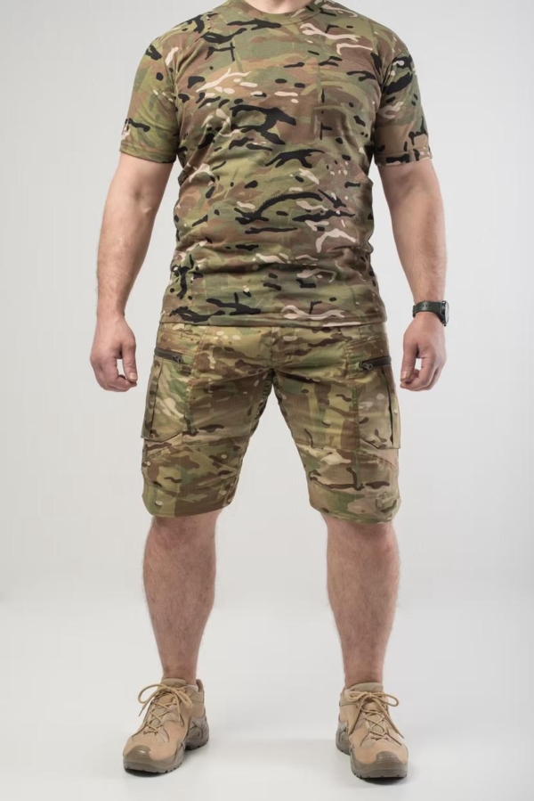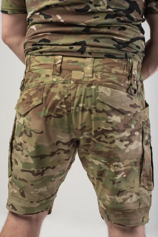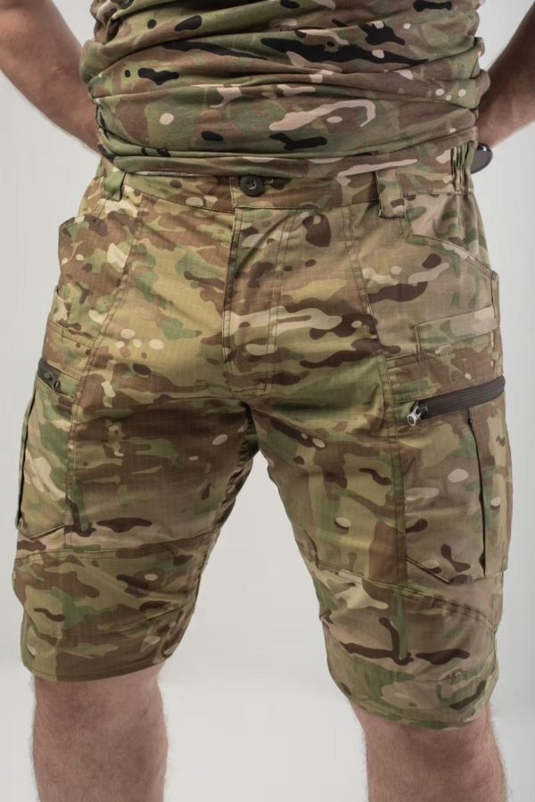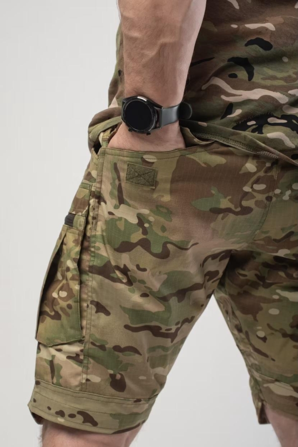 Шорти виготовлені з легкої та зносостійкої тканини ріп-стоп (65% бавовна, 30% поліестер, 5% еластан), що забезпечує довговічність і комфорт у спекотну погоду.