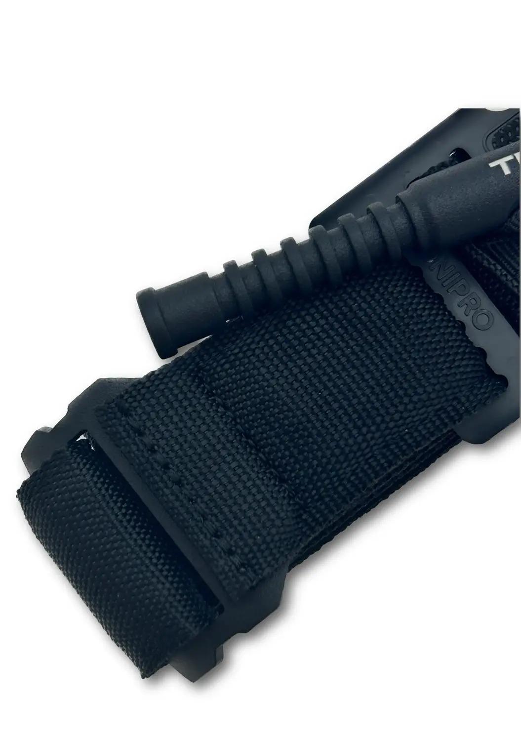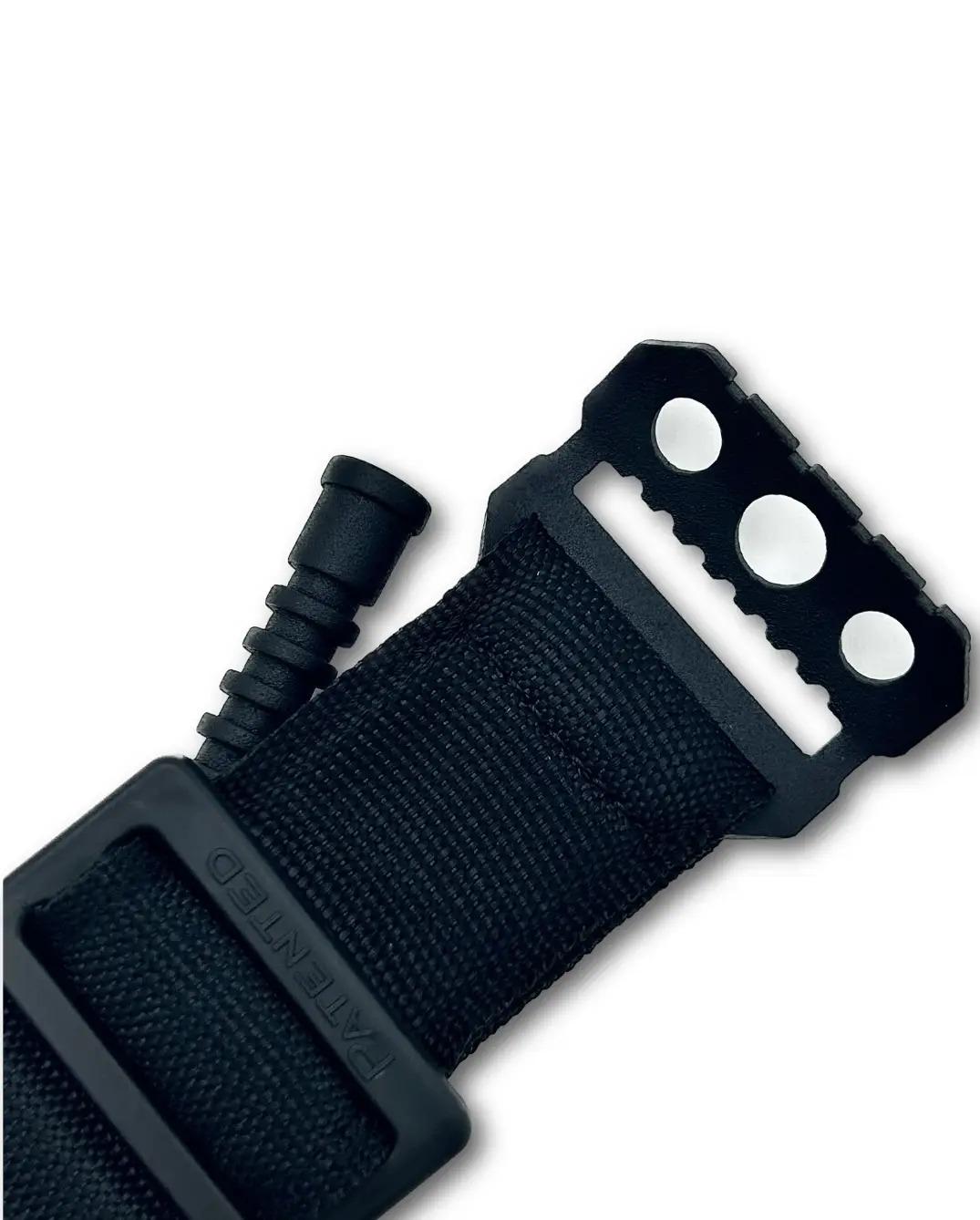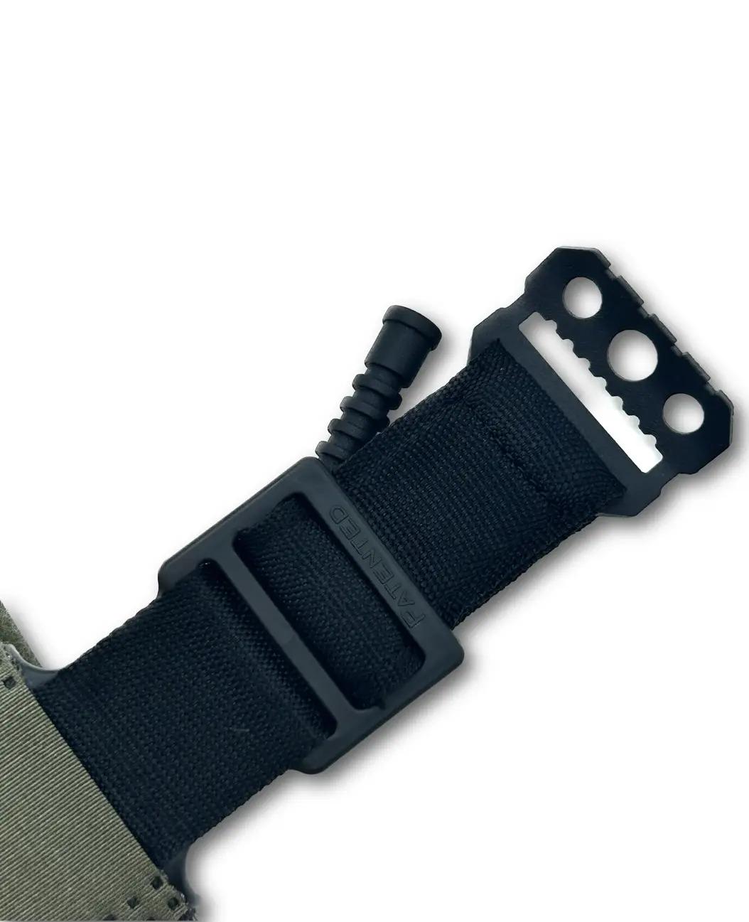 • Пряжка з насічками для надійної фіксації стрічки та стоп-фіксатора (зроблена з металевої фурнітури, яка здатна витримати екстремальні фізичні навантаження);