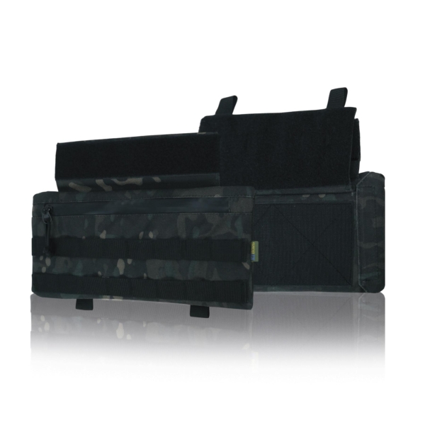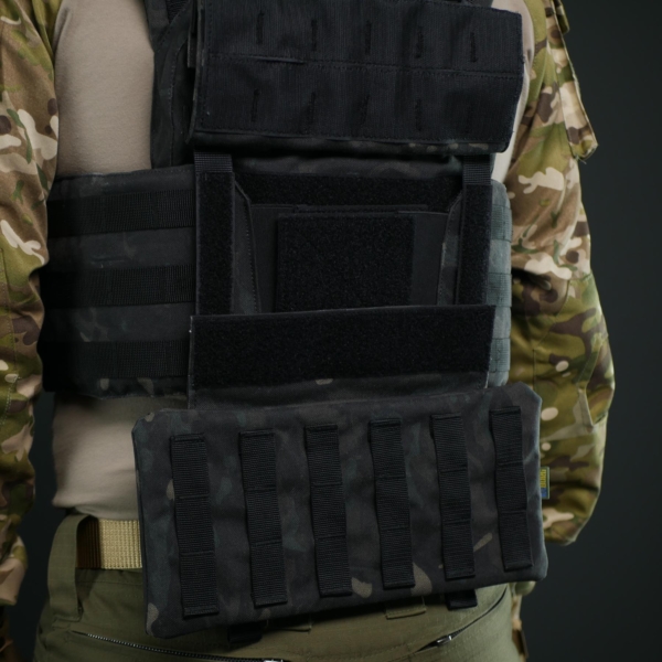 На фронтальній частині розташовані два ряди MOLLE та додатковий карман із прорезиненим бігунком і пулером для карт, документів чи дрібних речей. З тильного боку — система MOLLE, яка дозволяє інтегрувати чохол із напашником Militex у спільний модуль захисту живота.