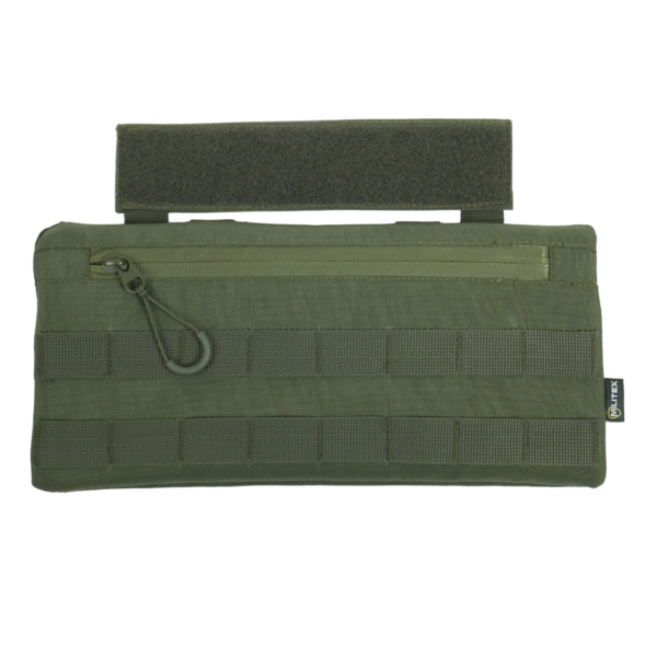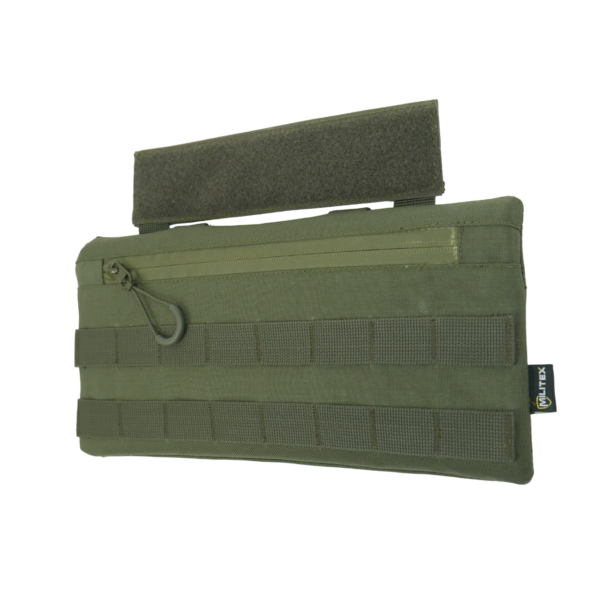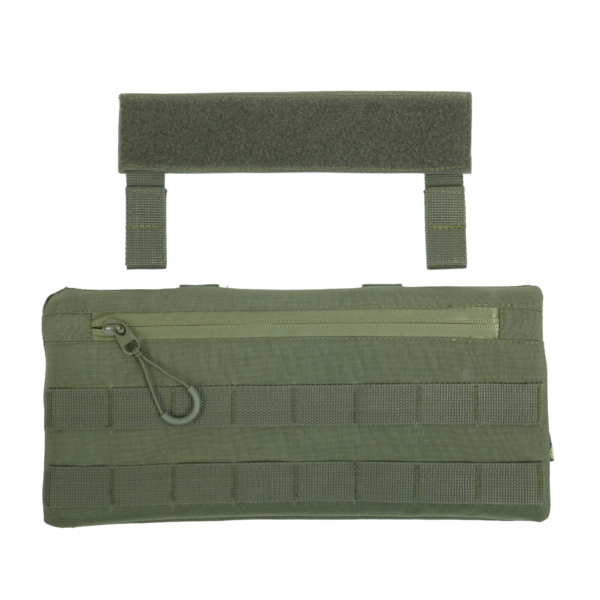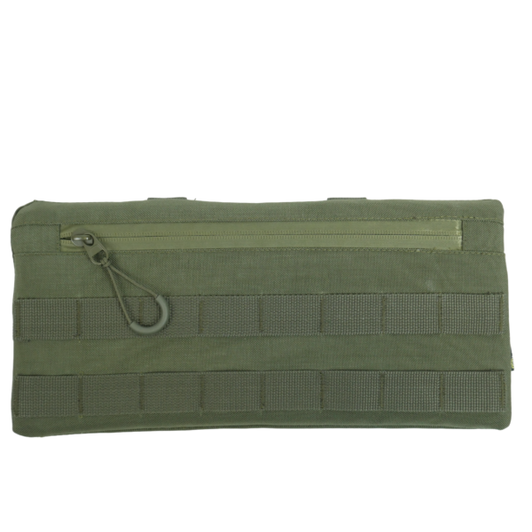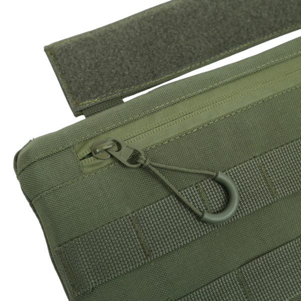 Пакет легко вставляється у чохол і фіксується надійною велкро-застібкою. На фронтальній частині є два ряди molle для кріплення оснащення, а також кишеня з прорезиненим бігунком і пулером для зберігання карт, документів чи дрібних речей.