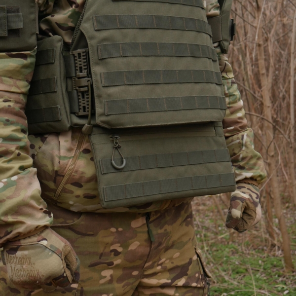 - Два типи кріплення: знімна велкро-панель та система molle (сумісна з більшістю плитоносок).