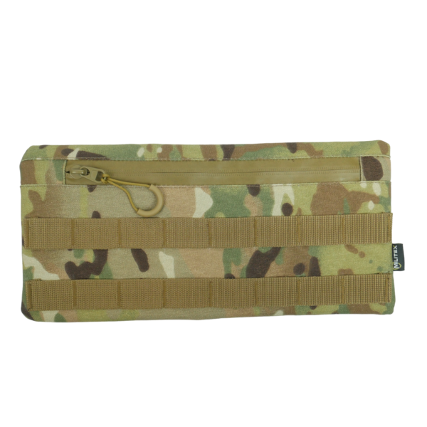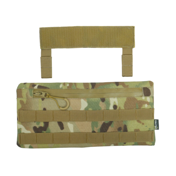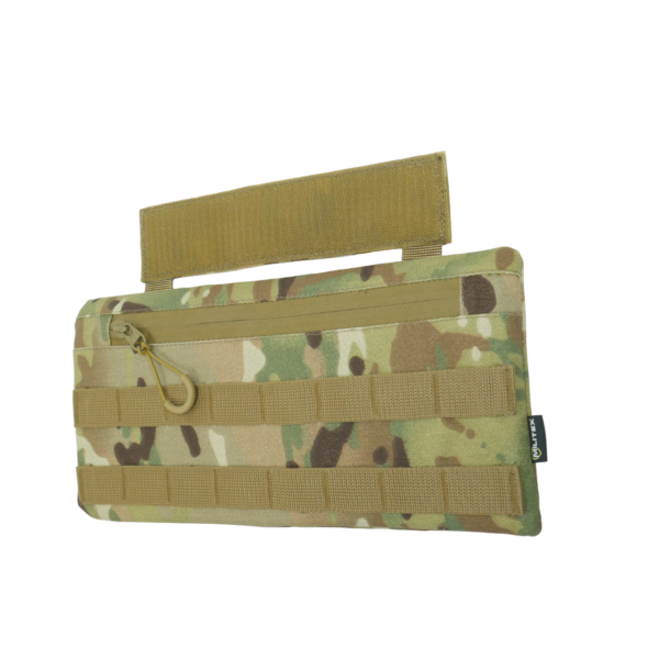 Балістичний пакет легко вставляється всередину та надійно фіксується на велкро. Фронтальна частина обладнана двома рядами MOLLE й додатковим карманом із прорезиненим бігунком та пулером для карт, документів чи інших дрібних речей. З тильної сторони система MOLLE дозволяє інтегрувати чохол у модульний комплект із напашником Kiborg.